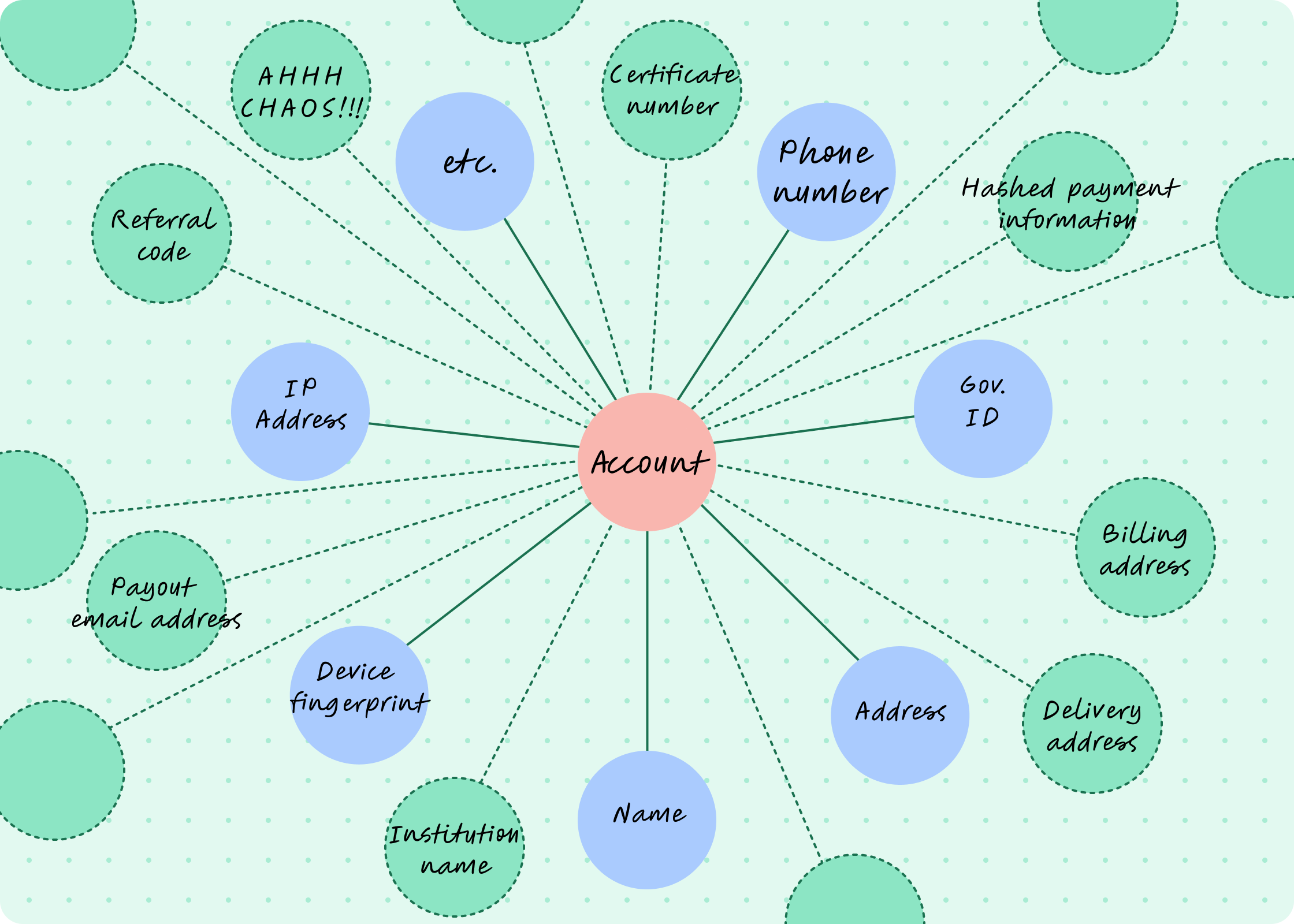 This first iteration had a collection of fixed node types (name, address, phone number), and it worked great for a while. However, customers soon realized that the more data they had in Persona, the more insights from Graph they would have. With this flywheel going, we had lots of requests to process graph relationships for custom data collected outside of Persona, too. With that, the data schema would look like this: